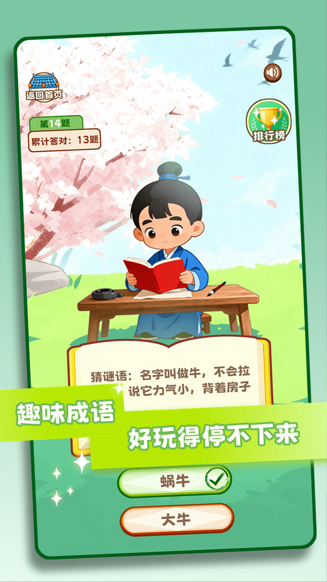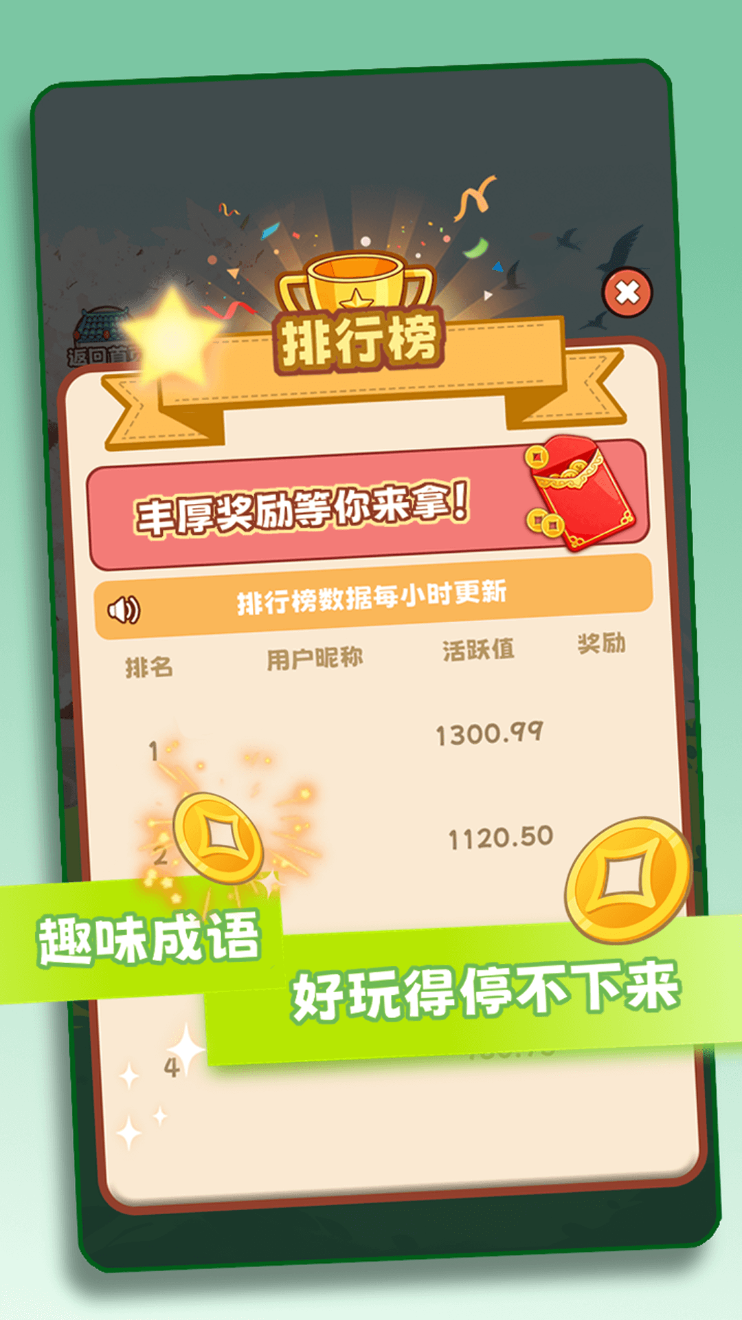 一款休闲时尚的记成语软件,借助各种趣味小挑战一步步考验你的成语储备,通过有趣的答题模式天天进步,让你在轻松有趣的过程中边学习成语,每天收获知识还可以获取红包。